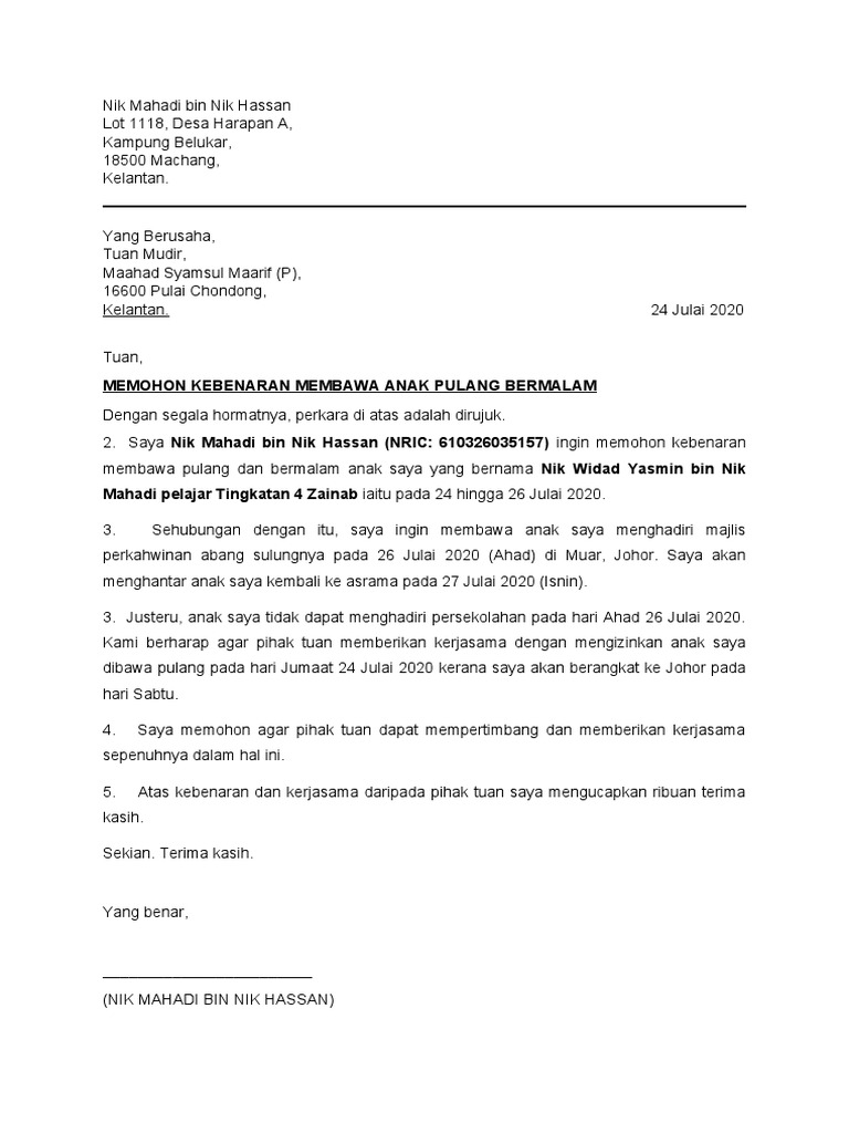 Contoh Surat Rasmi Permohonan Balik Bermalam